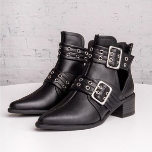 The Oliver Boots are bold, edgy and on trend! It features silver buckle and grommet accents on block faux leather, with a back zip up design. They have a pointed toe and a low stacked heel, combining style with a touch of rock inspired attitude. Style with dresses, midi skirts, or denim.