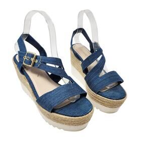 Bamboo Open Toe Platform Wedge Sandals Buckle Ankle Strap Blue Denim Size 7.5
