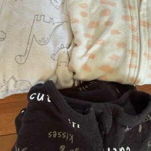 Cozy and adorable kids pajama set featuring playful designs. Includes black pajamas with fun text, white pajamas with dinosaur prints, and cream pajamas with polka dots. Perfect for a comfortable night's sleep. Normal wear. 6-9m. Brands: charolette&star, lullaby baby.