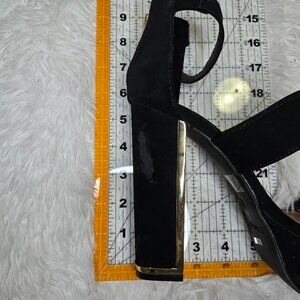 They feature a chunky heel, an ankle strap, and a platform sole,