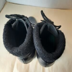 Elevate your style with these chic black ankle boots from Bamboo. Crafted from high-quality faux leather, these boots feature a lace-up closure and round toe shape. The 3-inch platform and 3 to 3.9-inch heel height add extra height while the lined interior ensures comfort. These versatile boots are perfect for any occasion, from travel to parties and even for casual wear. The eyelet accents and biker style make them ideal for those who love to make a statement. These boots are available in size 9 and have a standard shoe width. Good Preloved Condition.