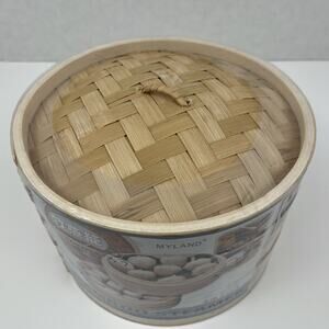 The Bamboo Steamer Set by KKTC Myland includes 2 steamer trays, 1 cover, and has an 8-inch diameter. Made of bamboo, this set is designed for steaming food in a healthy and efficient manner. The beige color and compact size make it easy to use and store in any kitchen. The set comes with a lid and baskets/trays, providing everything needed for a convenient cooking experience. NOTE: Cello wrapper is torn on the bottom.