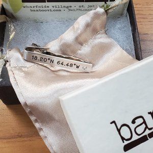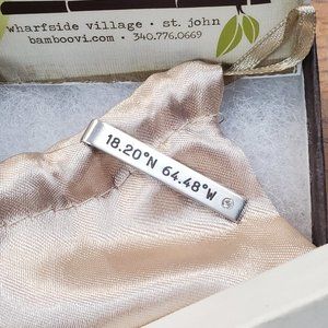This Bamboo Studio (of St. John USVI) tie tack has the latitude and longitude of St. John, US Virgin Islands and one small diamond.