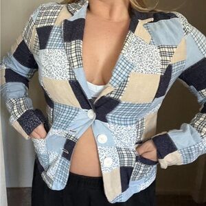 Vintage quilted blue + cream + white jacket size medium. Brand is Bamboo Traders. In great condition! Has front pockets and buttons are functional.