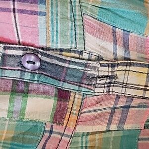 This skirt is so cute. Beautiful plaid patches seven together. button down the front. However, there is a button missing. it's not that noticeable. Waist flat measurement is 17". The top to bottom length is 24". Bo ho hippy vibe