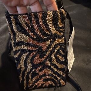 🆕 Bamboo Trading Hand Beaded Animal Print Club Bag Cellphone Crossbody Wristlet in excellent condition. It has an opening at the top for quick cellphone access. It has a zipper opening on the side for more secure items. It has a wristlet strap and a longer crossbody strap.
