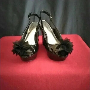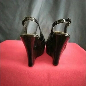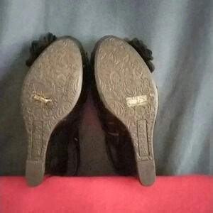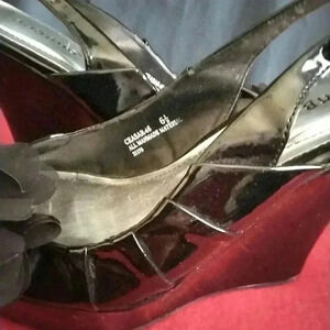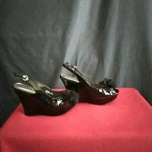New Patent Leather Wege Heels with Buckle Around Ankle, 4 1/2 in Wedge, Open Toe with Flower on Top