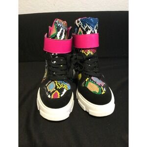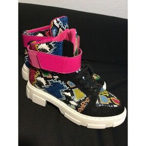 Statement sneakers with a bold edge! These high-top ankle boots command attention with their vibrant snakeskin print in a rainbow of colors, set against sleek black accents. A chunky lug sole provides both style and stability, while a bright pink ankle strap adds a playful pop of color. These eye-catching boots are perfect for adding a touch of urban chic to your everyday look, making a statement at festivals, or stepping up your street style game.