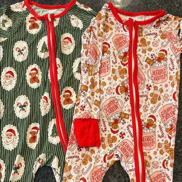 Adorable baby onesies featuring Santa and gingerbread prints. Perfect for the holiday season. Includes green and red designs.