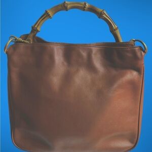 Calfskin cognac Gucci with bamboo handle. Inside and front of bag are in excellent condition. Backside of bag shows minor wear. Not that noticeable but still reflected in the price.