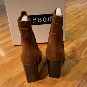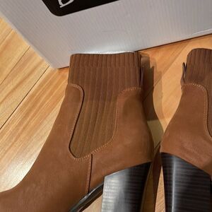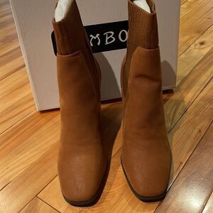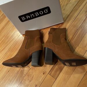 Bamboo deep camel faux suede knit sweater top/sides stacked heel boots. Pulling tan back heel. New, in box. Nonsmoking home.