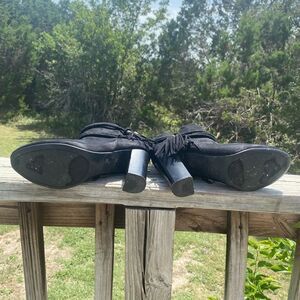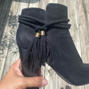 In excellent preloved condition with minimal noticeable signs of wear. These cute vegan man made inside zip up faux suede bootie has a 4 inch heel, 2 tassel , 3 rope detail on ankle .