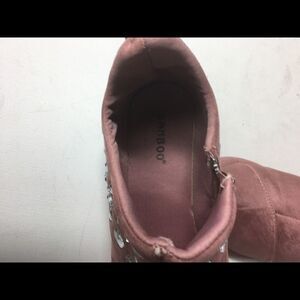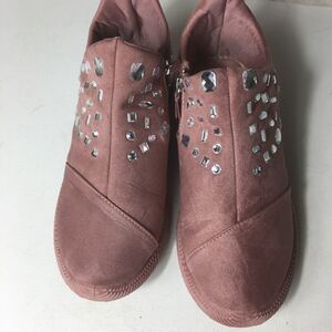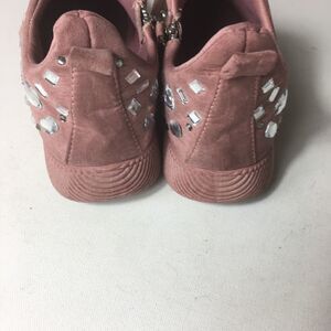 Bamboo blush pink ankle boots suede sneakers embellished with rhinestones size 9 run large can fit 9.5 comfortably pre owned normal signs of wear in the bottom see pictures no tear no stone is missing.