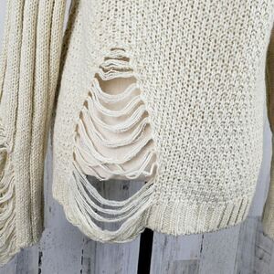 ~ Description: Ivory colored sweater with metallic silver thread woven throughout, intentionally distressed with large "holes" on the front, back and sleeves
