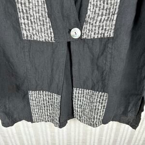 Colarless black linen blazer by Australia designer Banana Blue with a single mother of pearl button closure and black & white woven panel inserts.