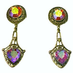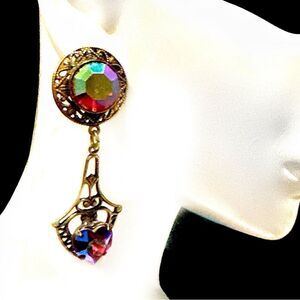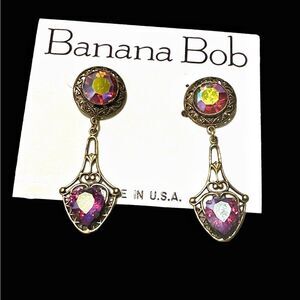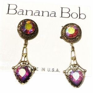 Banana Bob Red AB crystal heart dangle Edwardian pierced earrings ox gold