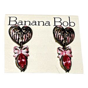 Beautiful Banana Bob ox silver heart shaped earrings with enamel pink bow that has a stunning pink marqusite crystal. Elegant and dimple pierced back earrings. Measure 2” x 1” , please see all photos for full description.