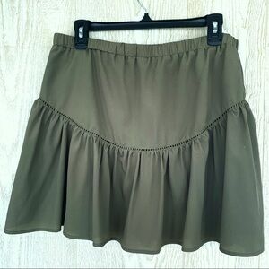 I love how comfy this skirt is with the elastic waist and lightweight flowy design. Army green. Fully lined. From Spring 2016. 100% Polyester. Machine wash, tumble dry. Style # 183919-00. Measures approximately: 16” across waist, 16 1/2” outseam. Collage consists of stock photos all other pics are actual skirt. Excellent condition.