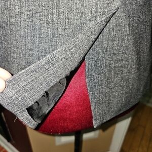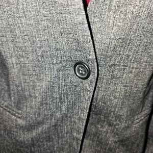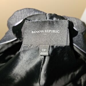 This is a Banana Republic blazer jacket. This is a size 0P. The colors are black/ grey. It has faux pockets and functional buttons on the cuffs. One button clouser. One cuff has some minor wear and pillowing