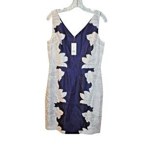 Polished and versatile Banana Republic sheath dress in a rich navy with an eye-catching floral/placement print. The rayon-linen blend gives a refined look with breathable comfort—perfect for work, cocktail, wedding guest, or date night.