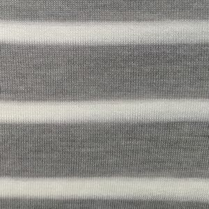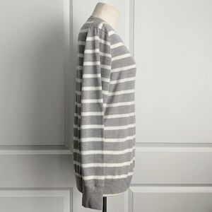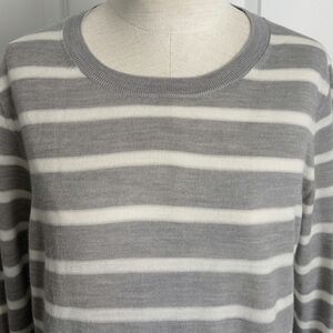 100% Merino wool extra fine knit lightweight sweater. Crew neck. Long sleeves. Fine rib knit collar, cuffs, hem. Horizontal grey and white stripes. Slips on over head.