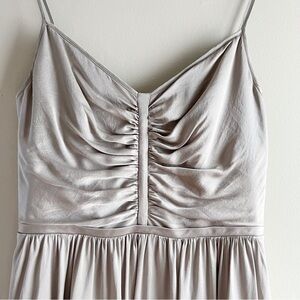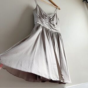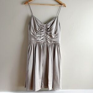 100% Silk Mini Dress by Banana Republic, featuring spaghetti straps, ruched bodice, sweetheart neckline, back zipper closure, cinched waist, swing skirt, mini length. Color: champagne / beige / white gold / neutral.
