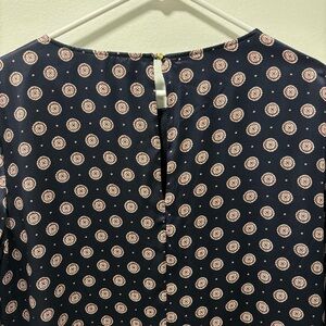 Red and blue geometric pattern with a ruffle across the front and down the sleeve. Gold hardware. Key hole back, pockets on side.