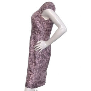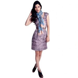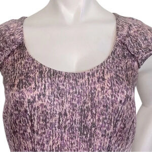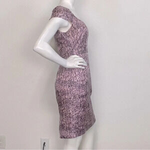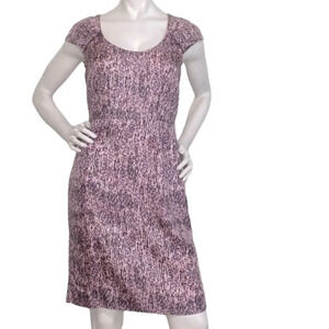 Banana Republic 100% silk sheath dress with pink, gray, white, purple, and lavender printed pattern. This lightweight, body hugging dress features adorable cap sleeves, deep scooped neck, and zip back closure.