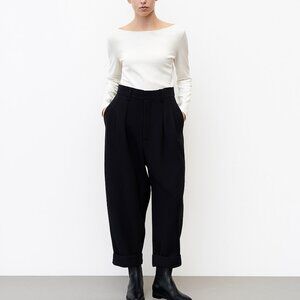 Style keywords: menswear-inspired tailoring, quiet luxury, workwear chic, minimalist trousers, 90s power dressing, Italian wool, pleated pants, business casual, structured fit, timeless essential