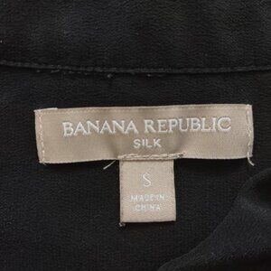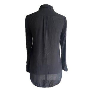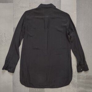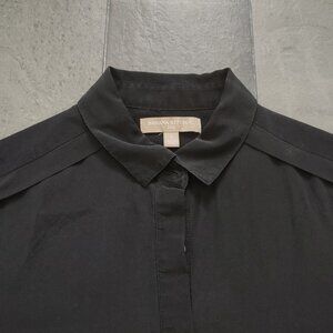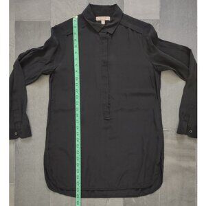 100% silk blouse. Black. Shirt collar, tunic length, curved hem. Popover style with hidden button placket. Long sleeves with button closure at wrist.