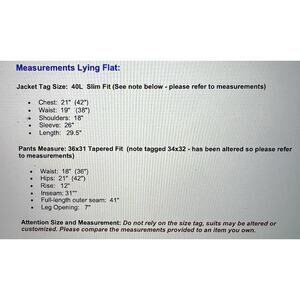 Attention Size and Measurement: Do not rely on the size tag, suits may be altered or customized.