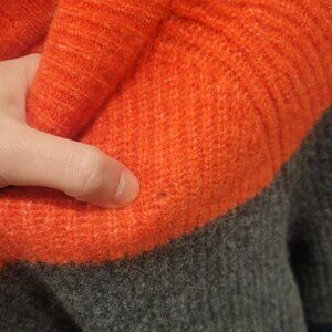Colors are from top down; beautiful neon orange/red, dark grey, navy blue, and the ends of the sleeves have a mulberry pink color