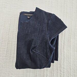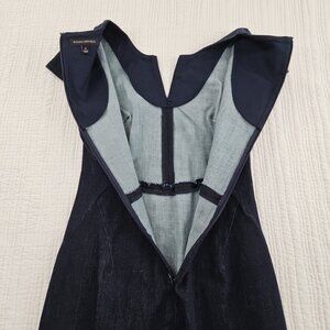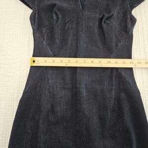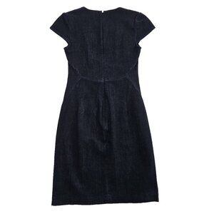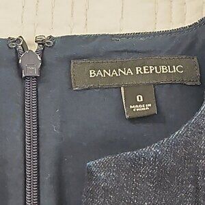 The Banana Republic Angled Seam Pencil Dress is a stylish and versatile option for women in size 0. This navy dress features a V-neckline, sleeveless design, and a zipper closure for a sleek look. Made from a comfortable cotton blend denim fabric, this knee-length dress is perfect for various occasions such as workwear, parties, or casual outings.