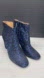 Soft rounded toe, inside zippered, 3.5 inch block heels. Shoes have only been worn a few times. Some flaking can be seen around the interior ankle.