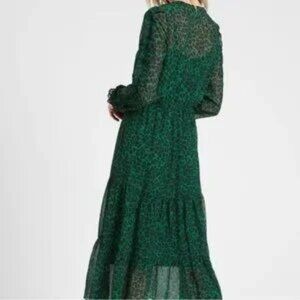 Banana Republic green and black animal print midi dress. Size XS. Full slip lining included. Elasticized waist; semi-fitted. Split neck collar. Elasticized cuffs. Polyester, machine wash.