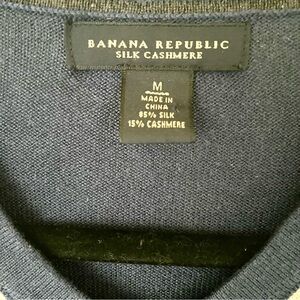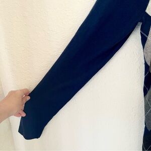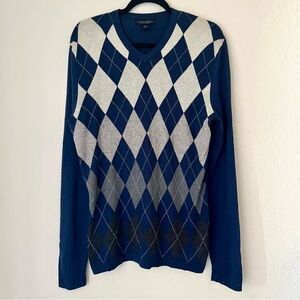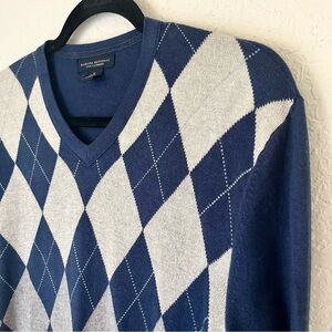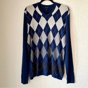 Banana Republic Argyle Silk Cashmere V Neck Pullover Sweater. Very Good pre owned condition, I don’t remember my husband having ever worn this. Navy with different shades of grey in an Ombré gradient pattern. Size is Medium.