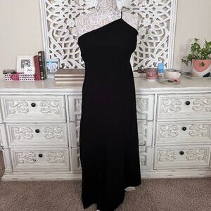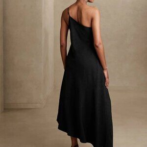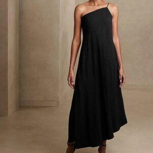 Asymmetrical Flounce Maxi Dress from Banana Republic Factory. Black, size 0P. One-shoulder neckline. Sleeveless. Adjustable spaghetti strap. Invisible side zipper at wearer's left. Asymmetrical flounce hem. Lined to flared hem. Front body length from bodice: Petite 49.5"
