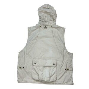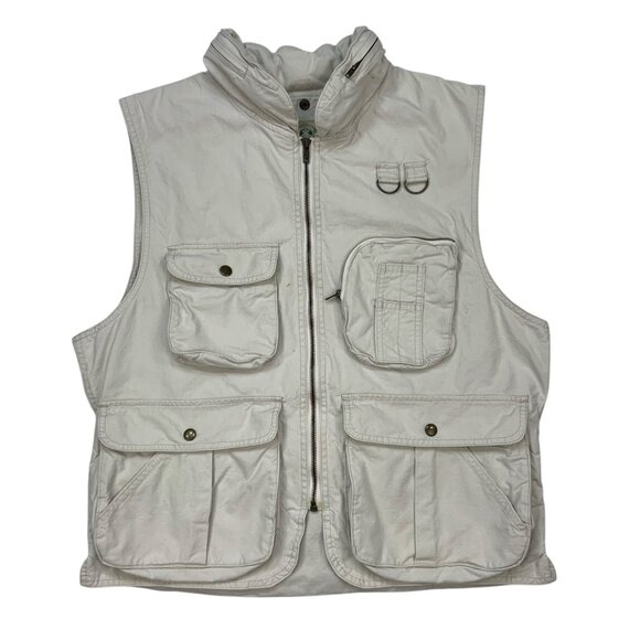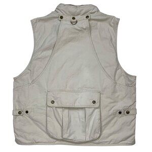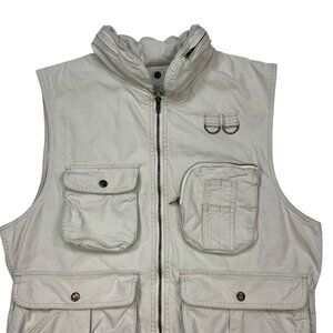 This Banana Republic Authentic Safari & Travel Clothing Co. men's Vintage Fishing Vest makes a statement due to it's sleeveless style, zip packaway hood, zip front, pockets, zipper/snap chest pockets, adjustable side waist snaps, back snap panel and cream/off white (light beige) shade.