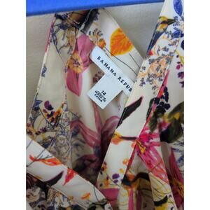 EUC, no stains, holes, or obvious signs of wear. Women's size 14 from Banana Republic. Satin-y top with beautiful tropical bird and flower print. Button up front with cascading ruffle front. 100% polyester. Machine wash cold.
