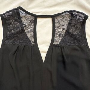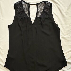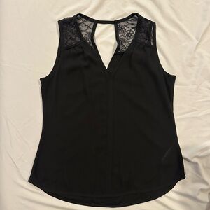 This chic black blouse from Banana Republic features an asymmetrical cut with stylish cut-out details. The sleeveless design and elegant lace accents along the neckline and shoulders add a touch of sophistication, making it perfect for both casual and formal occasions. No flaws.