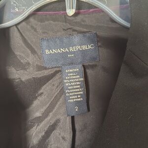 This Banana Republic blazer in classic black offers a sophisticated tailored fit with structured shoulders and notched lapels, making it ideal for professional settings. Super cute suede elbow patches. Two button in front closure. Perfect condition. Smoke-free home.