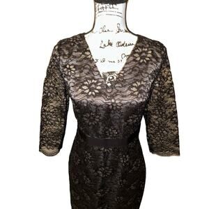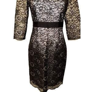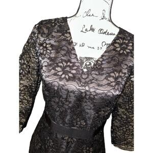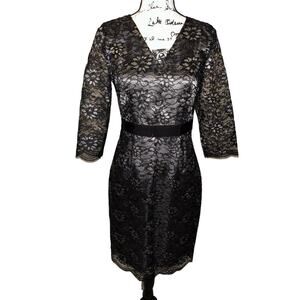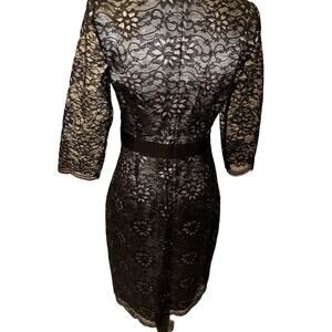 Command attention in this Banana Republic sophisticated black lace dress, where timeless elegance meets modern allure. Delicate floral patterns cascade over a contrasting lining, creating a mesmerizing visual texture that's both refined and eye-catching. A sleek, slimming ribbon belt accentuates the waist, enhancing the figure-flattering silhouette of this knee-length dress. With its graceful V-neckline and three-quarter sleeves, it's the perfect balance of modesty and style. Wear it to a chic cocktail party or a sophisticated dinner date.