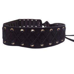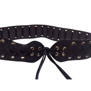Stylish black belt with lace-up design. Features gold eyelets. Perfect for adding flair to any outfit.