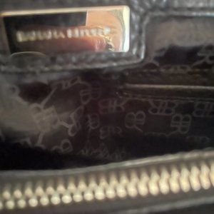 Silver hardware, very roomy. Great shape! Zippers all work, very clean --no stains I can see.