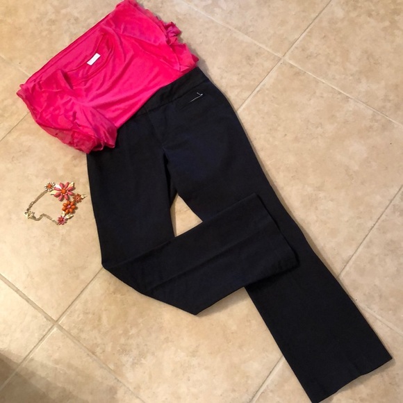 These are a great pant to own. Super comfortable. 98% cotton 2% Spandex. Has slight stretch. A little wider leg on bottom. Zipper pocket in front. As shown from dry cleaner on inside waist band there is some bleeding of color. Does not distract from pant as they are in wonderful condition. Waist 32” rise 12”, sits a little lower on waist. Total length 37” inseam 30”