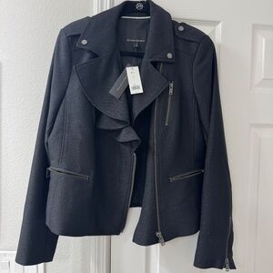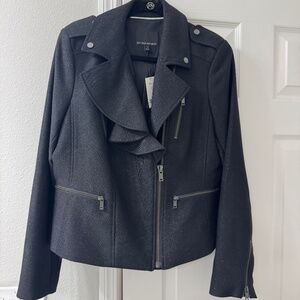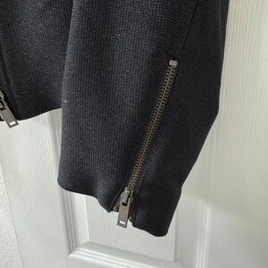 Chic and edgy Banana Republic moto-style jacket in a textured black fabric with a subtle shimmer. Features include: