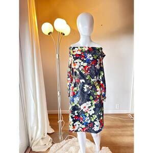 Beautiful Banana Republic women’s dress featuring a black background with vibrant multicolor floral print in red, green, blue, and white. Designed with a draped cowl neckline, 3/4 sleeves, and a knee-length cut. Fully lined in polyester for comfort and structure. Perfect for work, brunch, or special occasions.