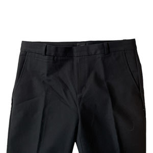 These Banana Republic pants feature a jet black color, two front slit pockets, two slit pockets in the back and black leather cuff trim at the ankle.