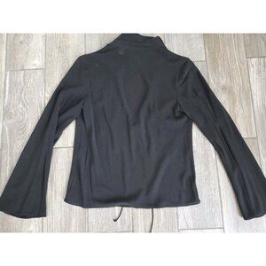 The Banana Republic Black Semi Sheer Silk Blouse in size Small features a flared sleeve, collared neckline, and lace-up closure. This Y2K-inspired top exudes a vampcore aesthetic with its lightweight silk material and sheer design, perfect for those embracing bohemian, gothic, or cosplay styles. Ideal for women looking to add a touch of edginess to their wardrobe with a classic black blouse that is both stylish and versatile.