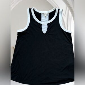 Stylish black tank top, dressy and perfect for the office or can be dressed down for more casual. Flowy and soft fabric, stylish keyhole neckline. White stripe down the back and around the neck and arms. Very cute!!! Perfect condition, only worn twice. 28” long